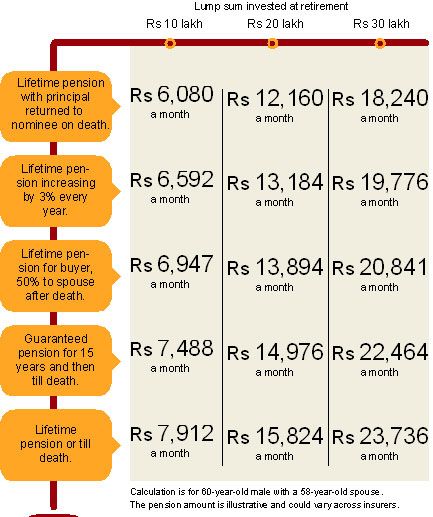 Annuities refer to the stream of income an insurer pays at regular intervals until your death or the end of the tenure you may have opted for. The corpus at the end of the accumulation phase will be paid out in two parts -one-third as a lump sum and the balance being converted into annuities. You will need to buy annuities using the amount accumulated by your pension plan or any lump sum. The annuity option you choose will depend on your requirements and expectations from the plan. This will be applicable primarily to those investors who may have built the corpus through pension plans until January this year and others with a fund pool. |